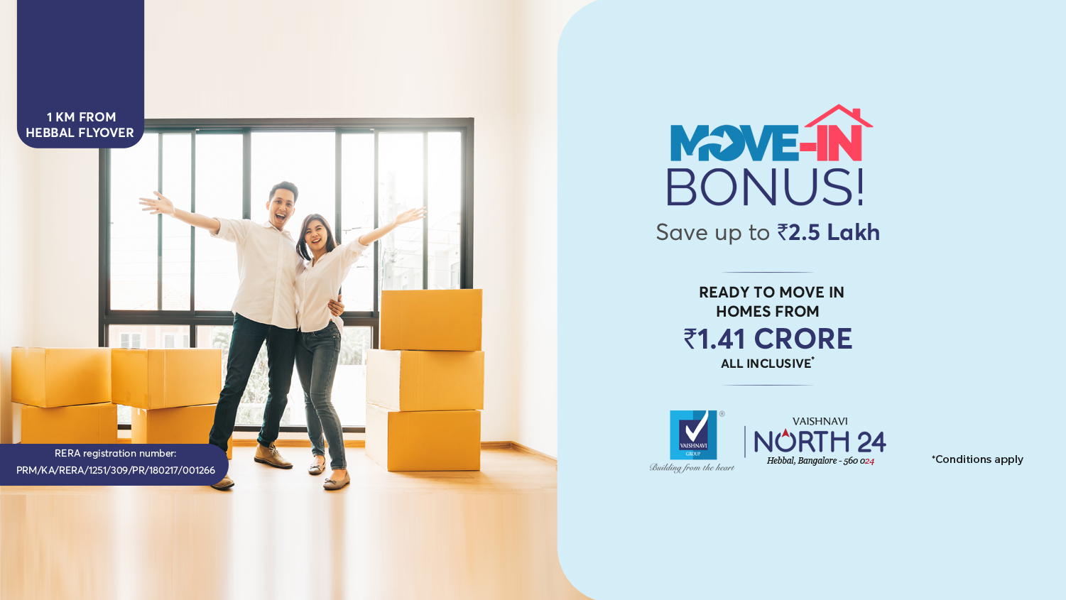 Vaishnavi North24 comes with excellent amenities and great safety features. Each of the blocks are designed to be earthquake resistant and have exquisite finishes to give your homes a premium touch. You are surrounded by a swimming pool, club house and landscaped gardens which make your everyday life one filled with comfort and luxury.